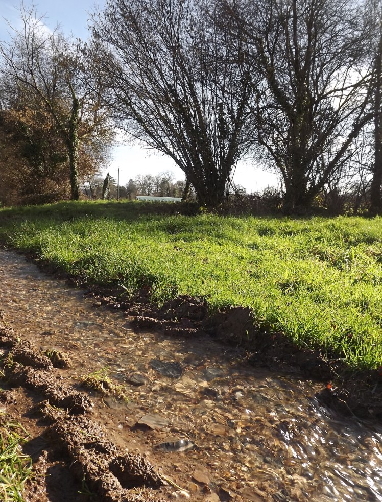 Cet hiver aura été généreux en pluie (800mm depuis début septembre, d’après la pluviomètre de la Cadehoule), et m’aura permis de constater à quel point l’eau qui ruisselle des prairies naturelles est limpide. En voyant ces ruisseaux éphémères scintiller sous le soleil de février, on se figure combien la prairie et le bocage sont d’intérêt majeur pour la préservation de la qualité des eaux, en jouant leurs rôles de filtre à particules et de rempart à l’érosion.