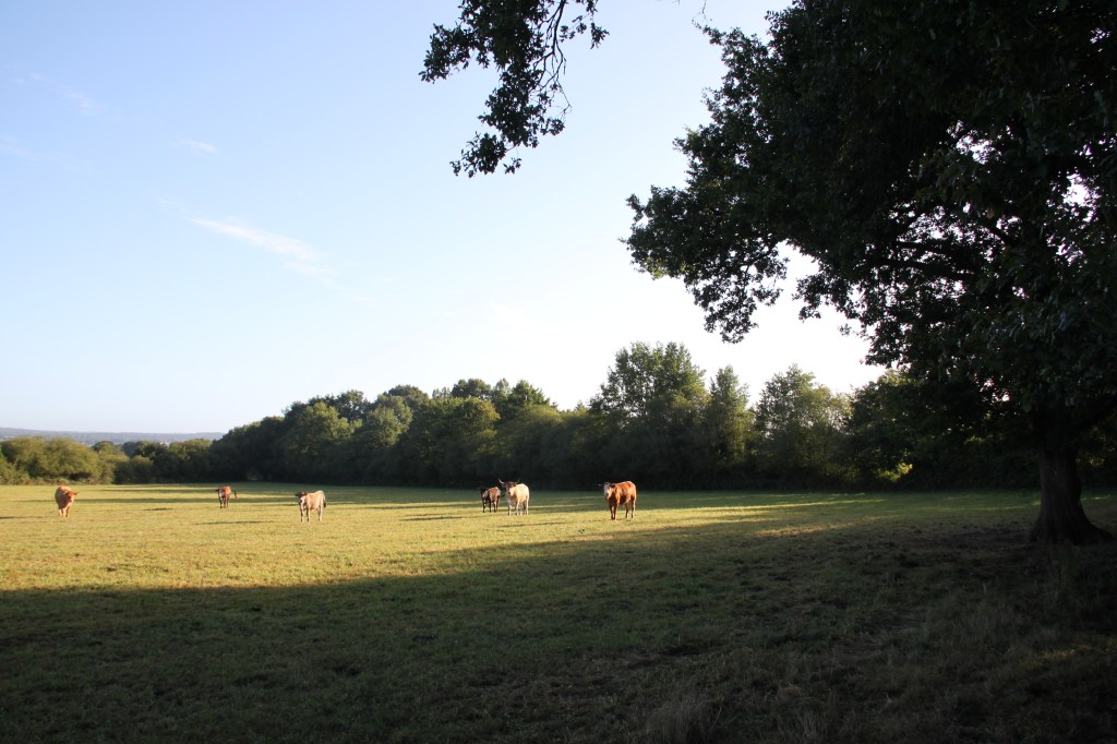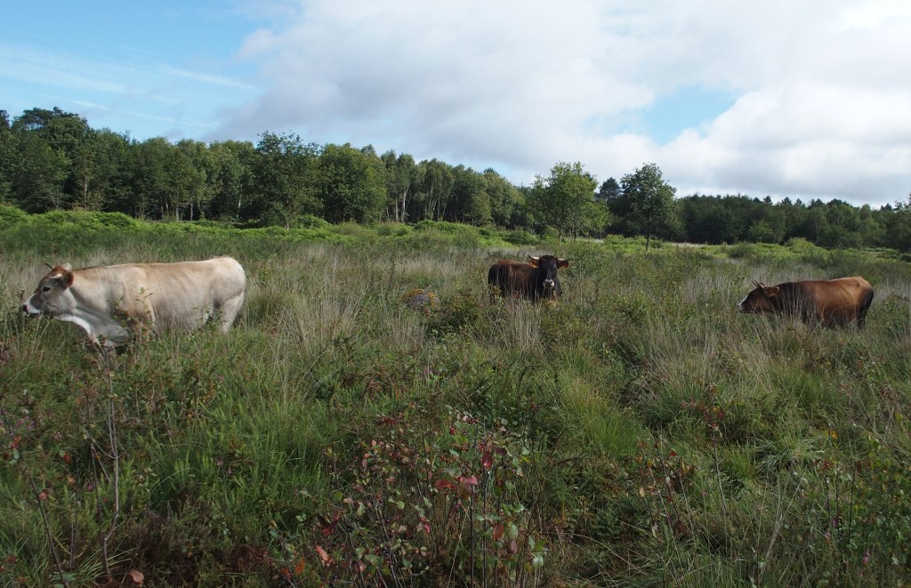 Par-delà les prairies à flore diversifiée présentes sur la ferme, on trouve la Réserve Naturelle Régionale des landes de Monteneuf. Depuis 2020, en partenariat avec l’association « Les Landes » (qui oeuvre pour la préservation et la valorisation des patrimoines culturels et naturels des environs de Monteneuf), mes jeunes boeufs pâturent une partie de la réserve pendant l’été, pour maintenir le milieu ouvert, et ainsi conserver le paysage de landes spécifique à ce territoire. La végétation de cette parcelle, naturelle et parfumée (essentiellement composée de molinie, graminées diverses, bruyère et arbrisseaux), riche en minéraux et oligo-éléments, contribue à la vigueur physiologique de mes animaux.