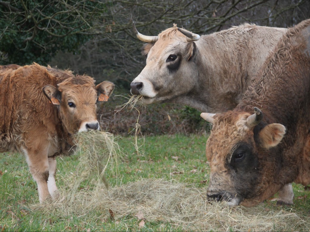 La viande que je vous propose est issue de véritables boeufs (contrairement à 90% de la « viande de boeuf » qu’on trouve en magasins, notamment issue de vaches laitières réformées). De races rustiques (Nantaise, Armoricaine et Bretonne), ils se contentent volontiers d’une alimentation herbagère, et leur croissance est lente, en adéquation avec leur rythmes morphologiques originels. En stimulant leur immunité naturelle, je parviens à les élever en bonne santé en ne leur administrant aucun médicament de synthèse (antibiotiques, antiparasitaires..).