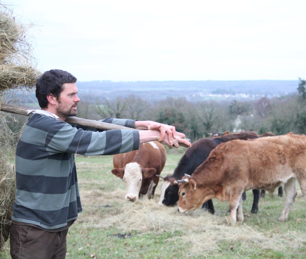 Je considère qu’il est important, si l’on souhaite produire une viande de qualité, notamment en terme de tendreté, que les animaux évoluent dans une ambiance tranquille. Les contacts réguliers entre eux et moi y participent, lorsque je vais déplacer leur clôture ou lorsque, en hiver, je leur distribue le foin à la main. Ces moments privilégiés en leur compagnie sont autant d’occasions de les approcher, leur parler, les caresser, parfois avec d’autres personnes, notamment avec les ados que j’accueille à la ferme. Je suis intimement persuadé que cette proximité les aide à se détendre, et évite qu’ils soient stressés lorsqu’un évènement nouveau survient dans leur décor.
